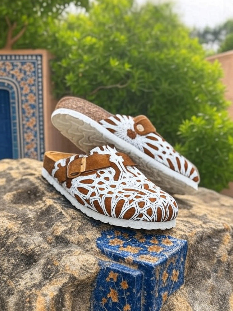 Step into cultural elegance with the AGL Essentials Moroccan Style One-Strap Collection. Featuring hand-painted Zellige patterns on premium leather with cork footbeds, these unisex clogs offer adjustable straps and durable soles. Perfect for adding a unique touch to your everyday style.